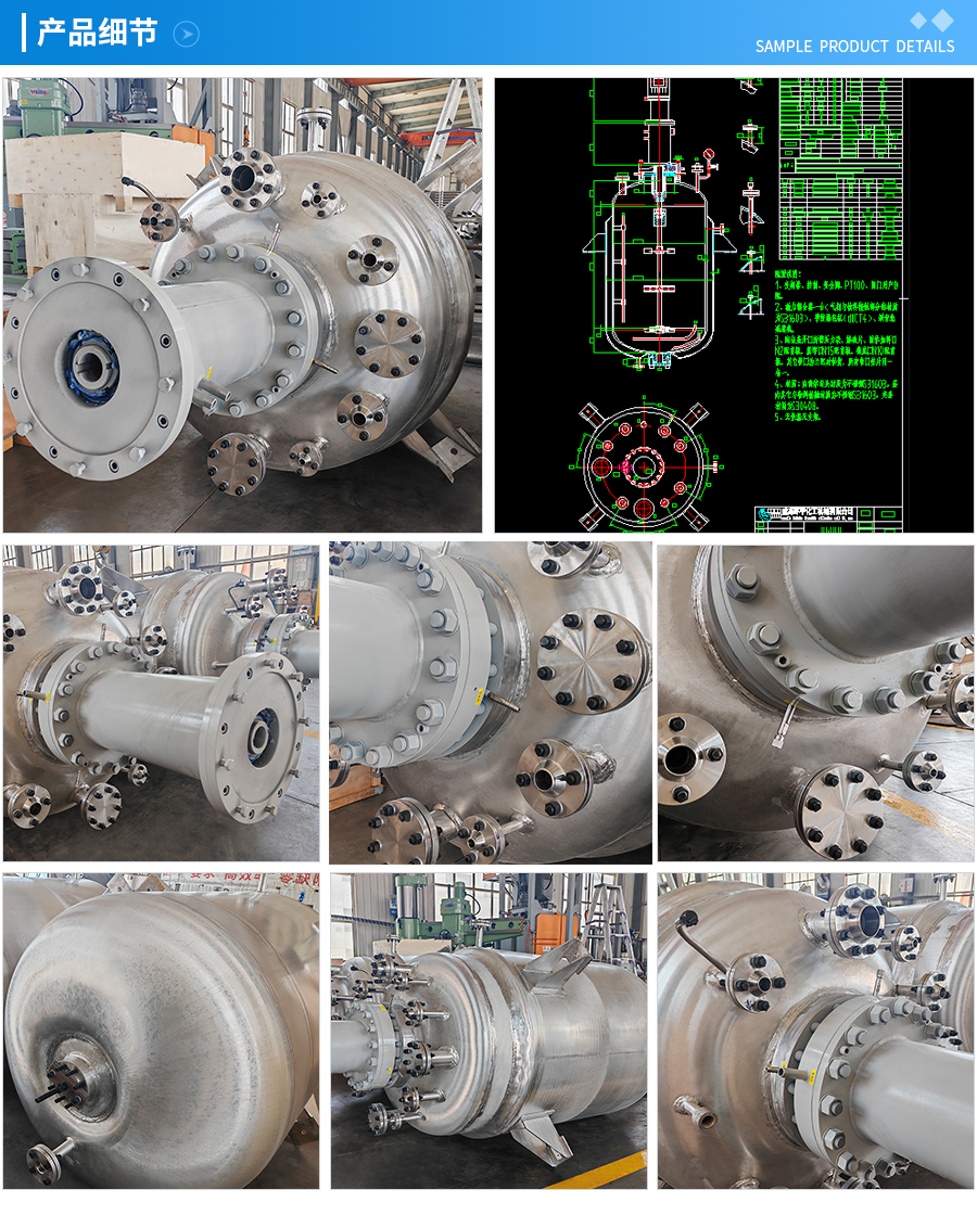 主要材料 釜体材料主要采用不锈钢与碳钢复合材质 S30408(304)+Q345R、S31603(316L) +Q345R、S32168(321)+Q345R, 也可是纯不锈钢材质,并可根据不同介质要求制作钛材、镍材、锆材、哈氏合金、蒙耐尔合金等复合材质反应釜,也可根据客户要求主要材料喷涂四氟PTFE/PPL。