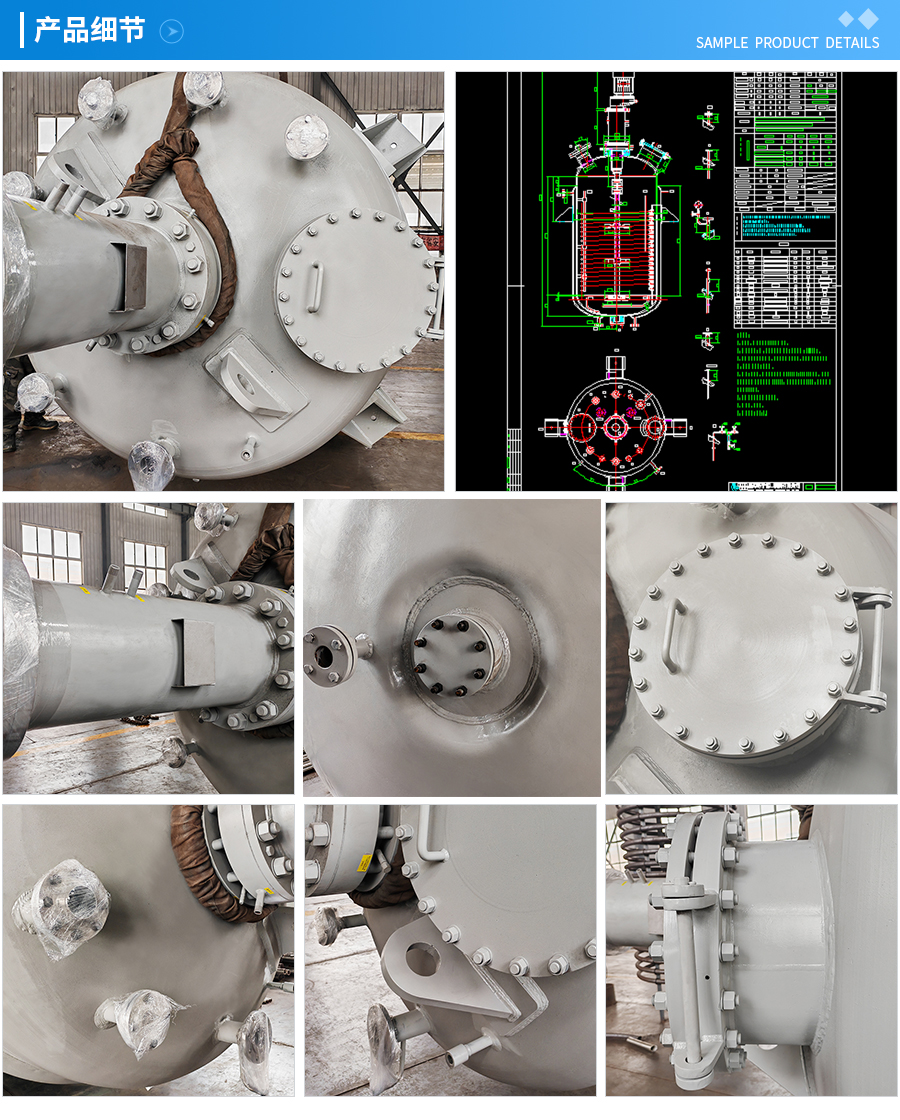 主要材料 釜体材料主要采用不锈钢与碳钢复合材质 S30408(304)+Q345R、S31603(316L) +Q345R、S32168(321)+Q345R, 也可是纯不锈钢材质,并可根据不同介质要求制作钛材、镍材、锆材、哈氏合金、蒙耐尔合金等复合材质反应釜,也可根据客户要求主要材料喷涂四氟PTFE/PPL。
