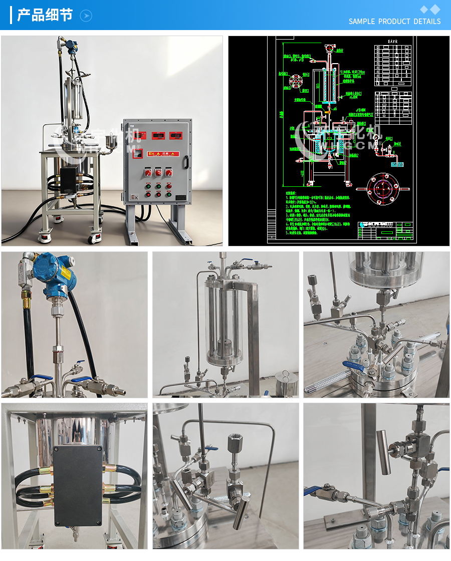 常规釜盖开口 气相口配针形阀,液相口配针形阀及釜内插底管,固体加料口配丝堵,测控温口配铂电阻,压力表安全爆破口配压力表及安全防爆装置,釜内冷却盘管进、出口配水咀